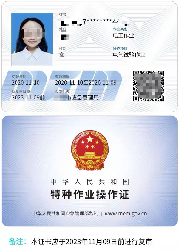 從2020年3月份起,高壓電工證書以新版的證書統(tǒng)一印制,分為電子證和實(shí)體證兩種類型,證書由相關(guān)部門頒發(fā),有效期是6年,每3年復(fù)審一次。